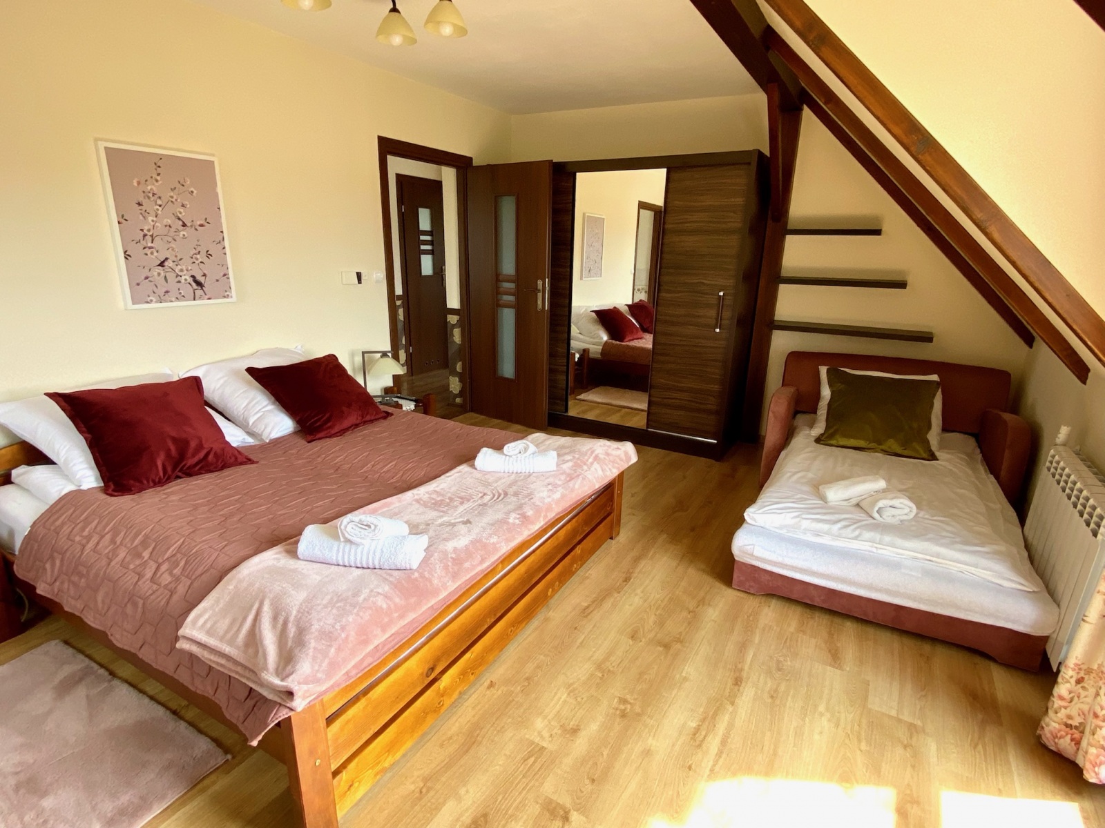 Pokój nr 3: podwójne łóżko, rozkładana pojedyncza sofa, szafa, komoda, telewizor smart TV, balkon;