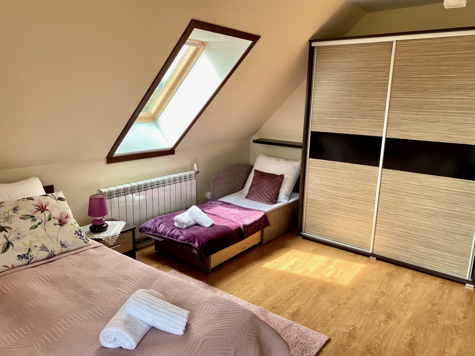 Pokój nr 3: podwójne łóżko, rozkładana pojedyncza sofa, szafa, komoda, telewizor smart TV, balkon;